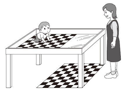 問題31 今、発達の実験のために、図のようなテーブル(テーブル表面の左半分が格子柄、右半分が透明な板で床の格子柄が透けて見える)の左端に、Kさん(1歳1か月)を座らせた。テーブルの反対側には母親が立っている。Kさんは、格子柄と透明な板との境目でいったん動くのをやめて、怖がった表情で母親の顔を見た。母親が穏やかにほほ笑むと、Kさんは母親の方に近づいていった。