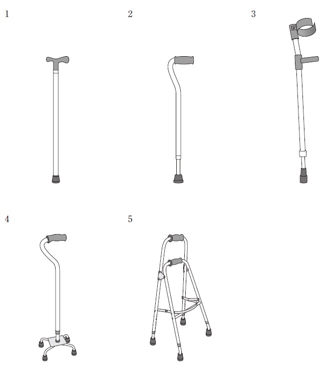問題105 次のうち、握力の低下がある利用者が使用する杖うえとして、最も適切なものを1つ選びなさい。