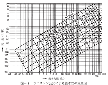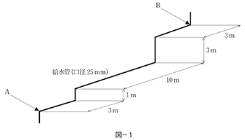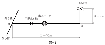 ① 給水管の口径 20mm ② A~B間の水平距離 30m ③ B~C間の鉛直距離 2m ④ 水道メータ、給水用具類による損失水頭の直管換算長 6m ⑤ A地点における配水管の水圧水頭として 25m